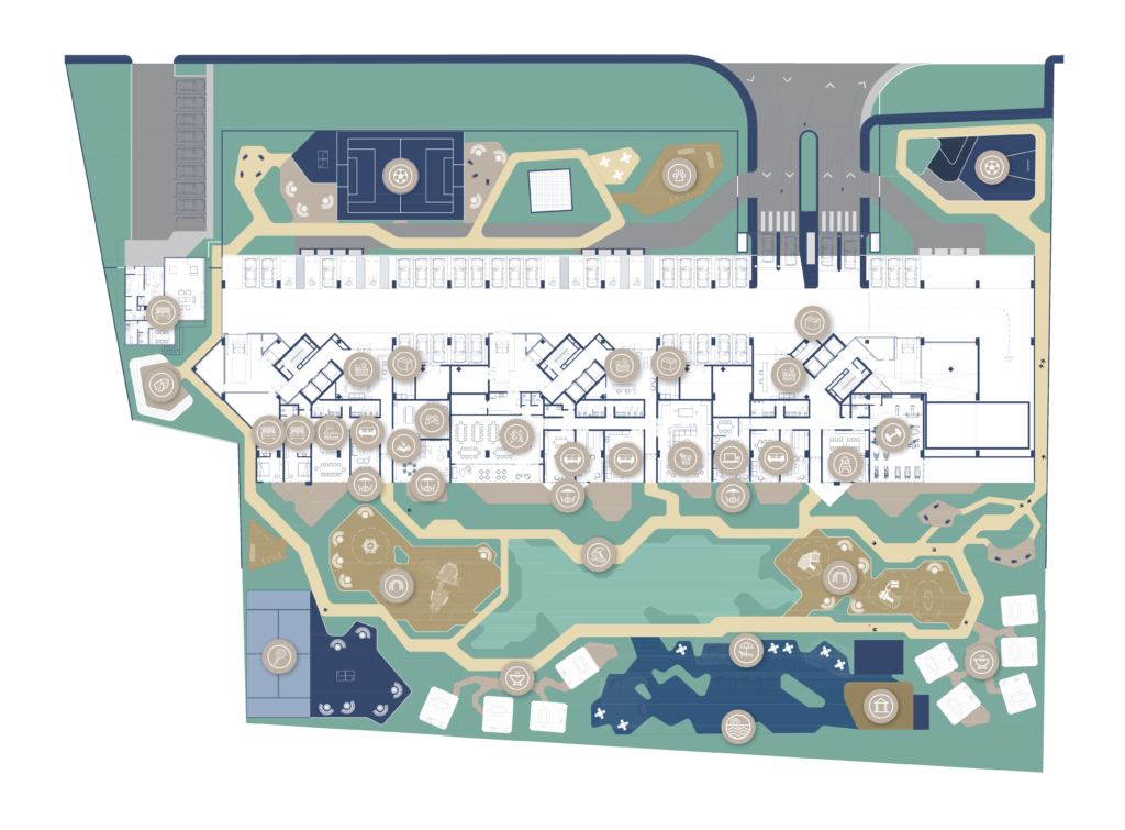 El master plan emerge en un área de 15 mil m2, en el que se desarrollan 25 mil m2 de espacios residenciales distribuidos en tres torres de 20 niveles cada una: 14 niveles de departamentos y 6 de estacionamiento.